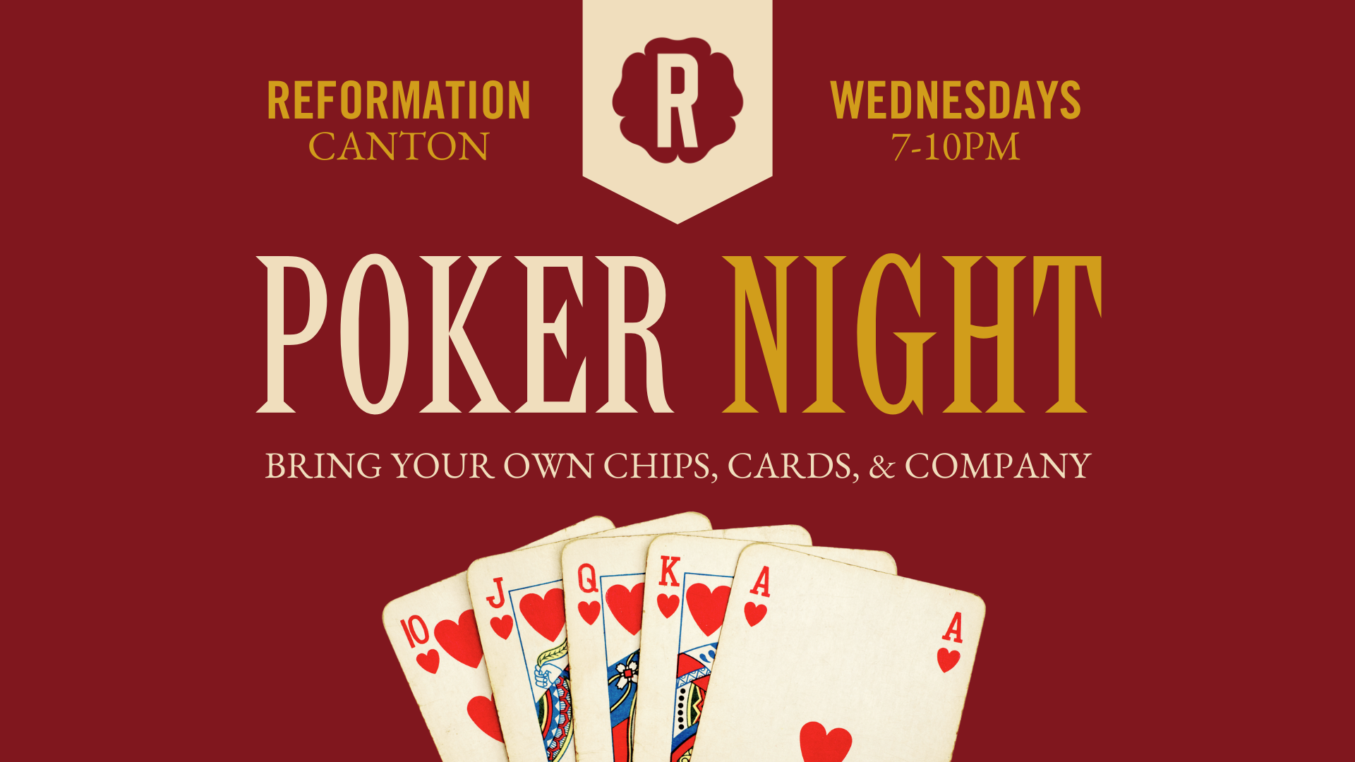 Need a place to hang out and throw down? We got you. Reformation Canton welcomes all card players to pull up a chair and practice your favorite Poker Games! We’ll provide the tables, you provide the rest. Please note: no money or prizes – just for funsies. Make sure to bring your own cards, chips, and company.