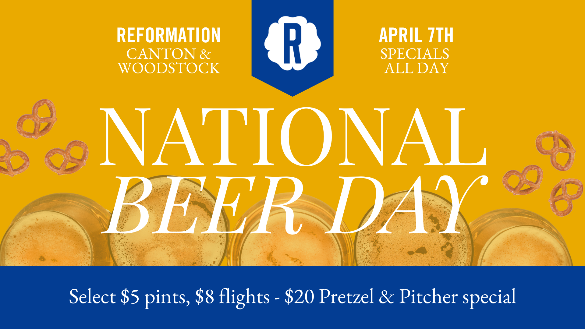 National Beer Day at Reformation - pretzels, pitchers, and the kind of Tuesday that's worth skipping work for. $20 Pretzel & Pitcher Special, $5 Select Pints, and $8 Flights all day at Canton & Woodstock. Call it a day, or call it "networking."